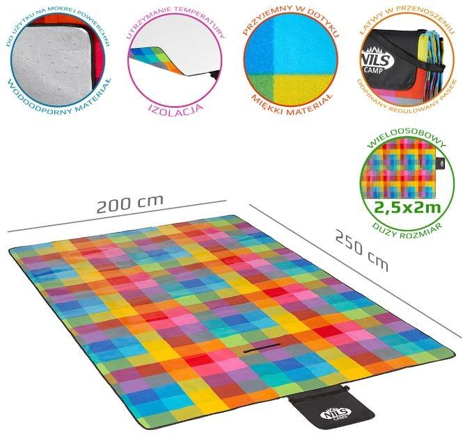 Piknik podloga je narejena iz 2 slojev. Zgornja je prekrita s prijetnim flisom na dotik, spodnji sloj pa je aluminijast premaz, ki zagotavlja toplotno izolacijo in je vodoodporen. Velikost več kot 2 metra je primerna za celo družino.