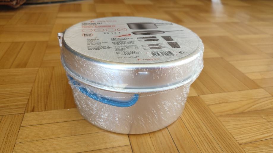 Prodam aluminijast nerabljen Quechua set posode za kampiranje, ostanek zaprtja spletne trgovine. Primeren za 2 osebi, vsebuje posodo, ponev, 2 žlici, 2 vilci in 2 kozarca.
