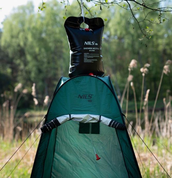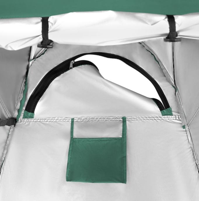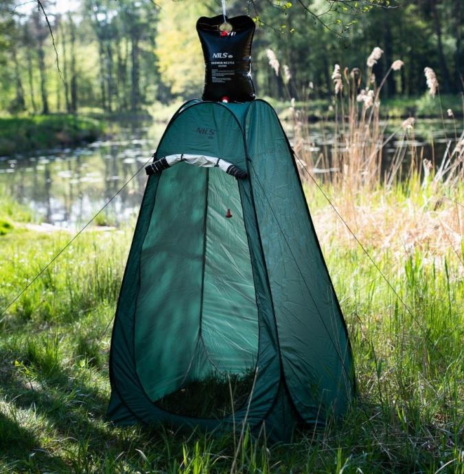 Pokončni šotor namenjen tuširanju, preoblačenju, kot wc, ali kot shranjevalnik pripomočkov v naravi in kampiranju. Visok šotor je narejen iz vodoodpornega materiala, v notranjosti pa je srebrna izolacijska plast, ki preprečuje segrevanje prostora. Poleg tega je material popolnoma neprosojen. Ima vhod na zadrgo, eno stransko okno ter strop za tuširanje. Zaradi višine 190 cm lahko skoraj vsak stoji brez ovire.