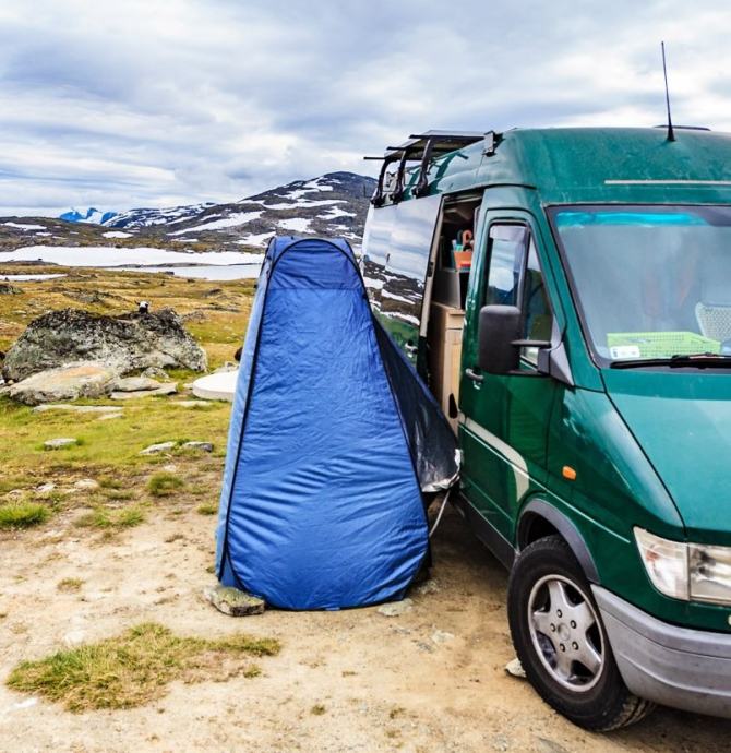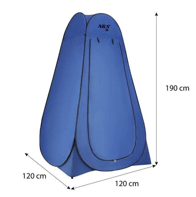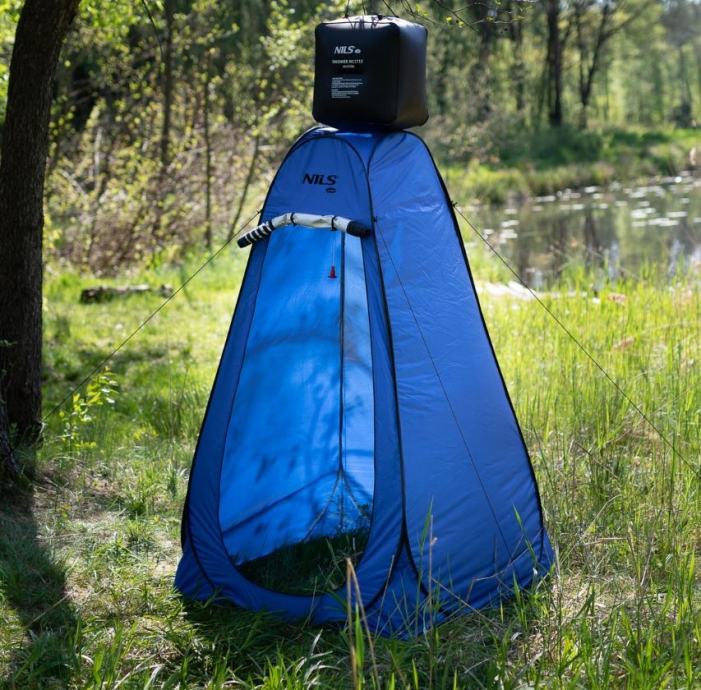 Pokončni šotor namenjen tuširanju, preoblačenju, kot wc, ali kot shranjevalnik pripomočkov v naravi in kampiranju. Visok šotor je narejen iz vodoodpornega materiala, v notranjosti pa je srebrna izolacijska plast, ki preprečuje segrevanje prostora. Poleg tega je material popolnoma neprosojen. Ima vhod na zadrgo, eno stransko okno ter strop za tuširanje. Zaradi višine 190 cm lahko skoraj vsak stoji brez ovire.