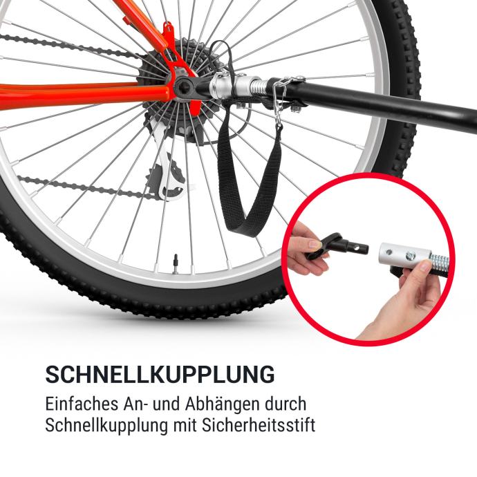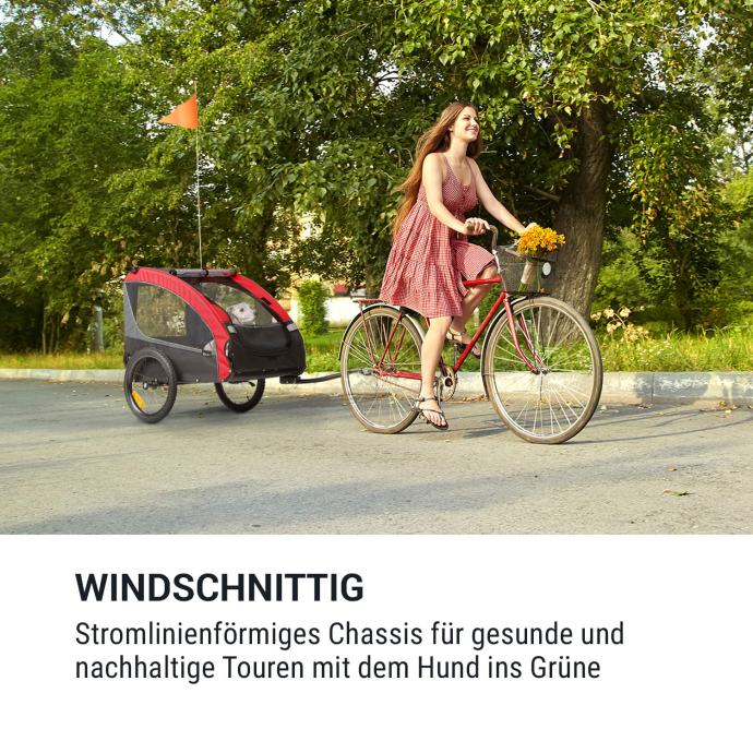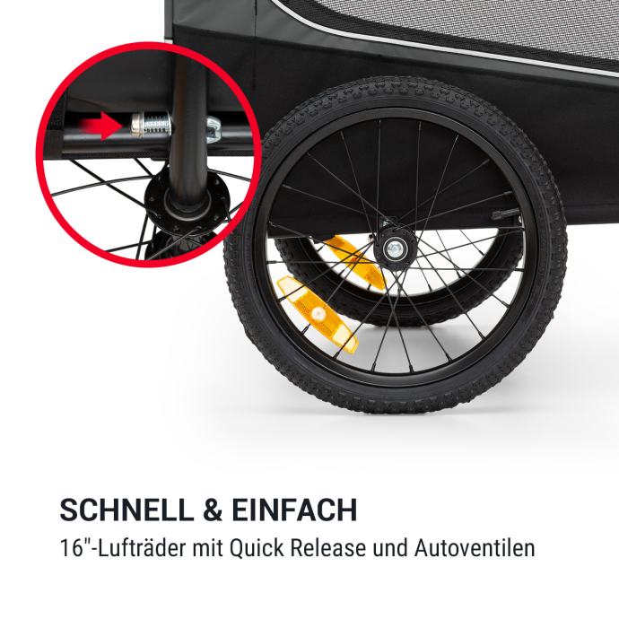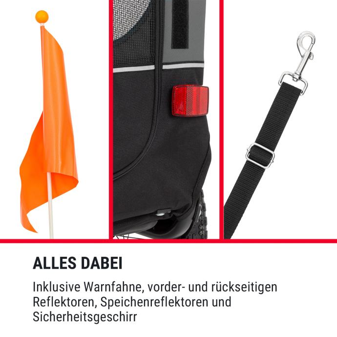 Prikolica za bicikel za pse Klarfit Husky prepriča s svojo hitro povezavo: Za varnost na potovanjih je prikolica opremljena z rdeče oranžno opozorilno zastavo, ki je pritrjena na 75 cm dolgem drogu, sprednjimi in zadnjimi reflektorji in dvemi zlatimi lučmi. Obe kolesi sta polnjeni z zrakom in se lahko zahvaljujoč avtomobilskim ventilom na vsaki bencinski črpalki napolnijo brez tega, da se obremenjujete s tlačilko.