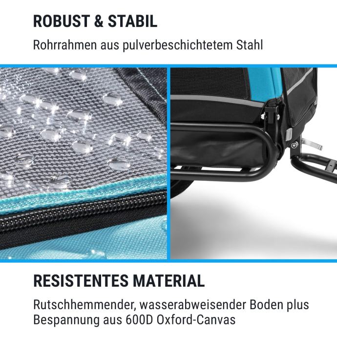 Zaradi notranjosti s prostornino 240 litrov in nosilnostjo do 40 kg ter koncepta SmartSpace izdelek ponuja dovolj prostora za udoben prevoz manjših in srednje velikih psov. Prikolica je izdelana iz jeklenega okvirja, zaščitenega s prašno barvo in oblečenega v vzdržljivo oxfordsko platno. Tako bo vaš štirinožni prijatelj vedno odlično zaščiten. Prikolica je proizvedena posebno za transport psov, zato je opremljena z nedrsečo, nepremočljivo in lahko podlogo, ki je izredno preprosta za čiščenje. Podloga je izdelana iz umetne mase. Voziček se lahko pohvali tudi z visokokakovostnimi vzmetmi SoftRide Suspension. Predhodno nameščena notranja varovala poskrbijo za varnost živali med prevozom. Sprednja in zadnja stranica imata všito mrežico, ki preprečuje vstop muham in omogoča dobro prezračevanje, zaradi praktičnega sistema odpenjanja z zadrgo pa ima pes lažji vstop in izhod iz vozička. V primeru slabega vremena ali močnega vetra lahko sprednjo in zadnjo stranico popolnoma zaprete ob uporabi nepremočljive prevleke.