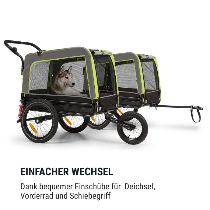 Kot že samo ime pove, lahko prikolica & voziček za pse 2 v 1 Klarfit Husky Vario prepriča na dveh ravneh: po eni strani se uporablja kot prikolica za kolo, pri čemer jo preprosto priklopite na zadnje kolo kolesa - ob uporabi 75 cm dolge vlečne ojnice in predhodno nameščene spojke. Po drugi strani lahko izdelek uporabljate kot voziček, ki ga potiskate med tekom ali na daljših izletih. Tu se vlečna ojnica premakne na enostavno nastavljivo sprednje kolo, medtem ko je po višini nastavljiv drsni nosilec nameščen na dva vtična dela na zadnji strani. Ko izdelka ne boste uporabljate, lahko dve zadnji kolesi kadar koli odstranite tako, da zaklenete ročico in zložite voziček v nekaj preprostih korakih.
