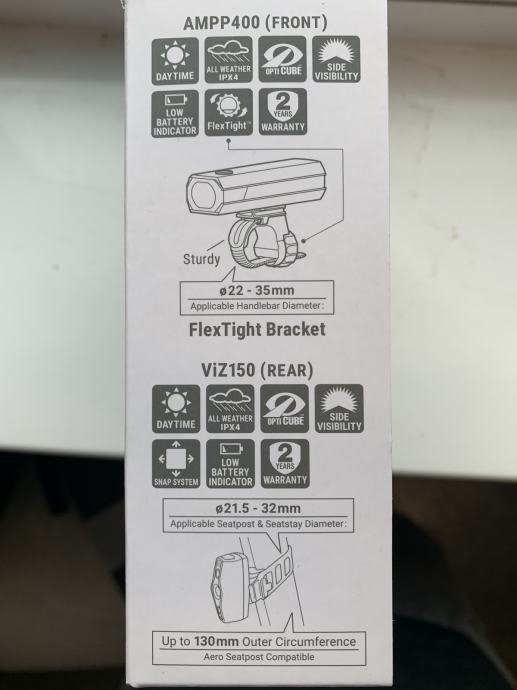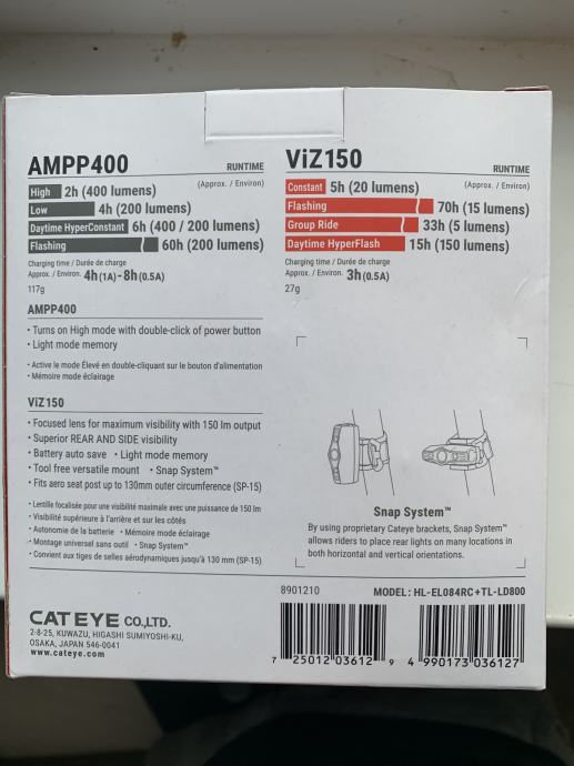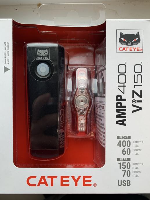 Prodam nov komplet zelo kvalitetnih luči Japonske znamke CAT EYE model AMPP 400 in VIZ 150 zadnja luč.