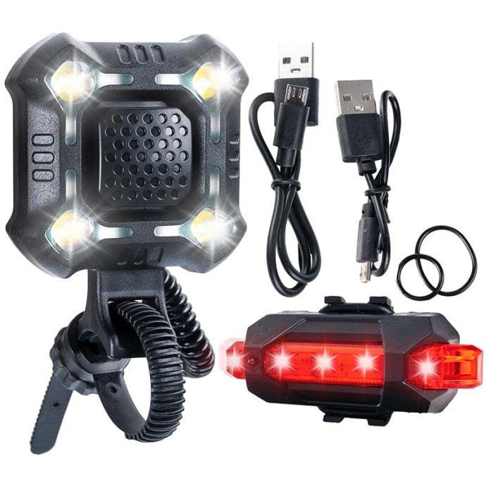 Set USB večbarvne akumulatorske kolesarske svetilke + zadnja luč in hupa