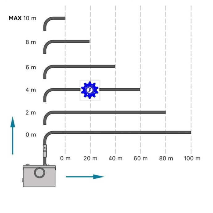 Maksimalna višina črpanja 10m, Maksimalna dolžina črpanja 100m