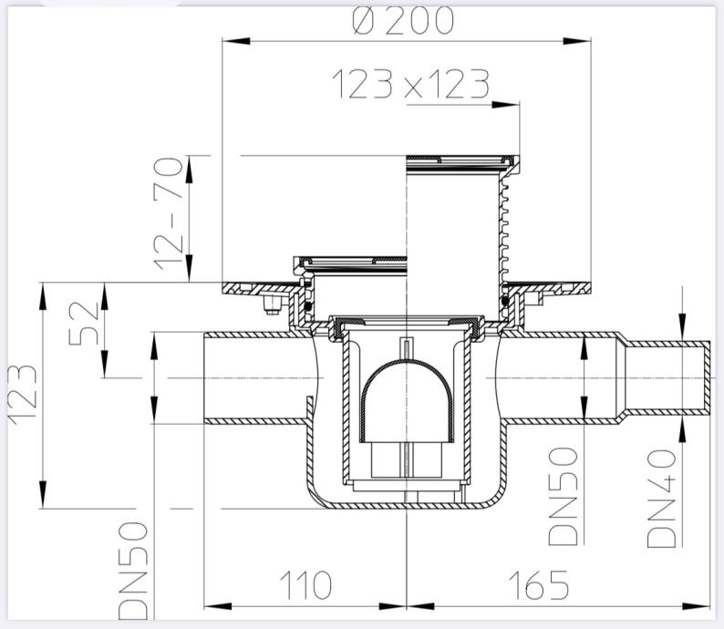Horizontalni talni odtok DN50 s tesnilno prirobnico, sifonskim vložkom z zaporo povratnega toka, stranskim dotokom DN40/50, skrajšljivim okvirnim nastavkom 14-74mm/ 147x147mm in nerjavečo jekleno rešetko 140x140mm. Vgradna zaščita je zajeta z dobavo.