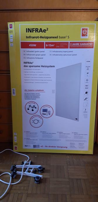 Prodam infrardečo panelno peč 450W za površino 6-15m2 na podstavku s kolesci. (Možna tudi montaža na steno ali strop.)