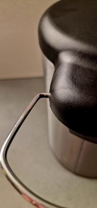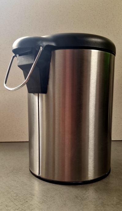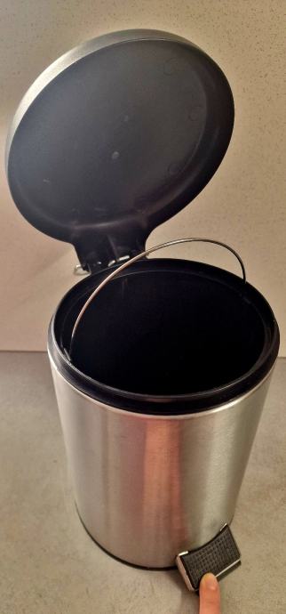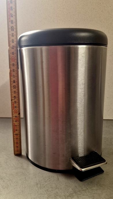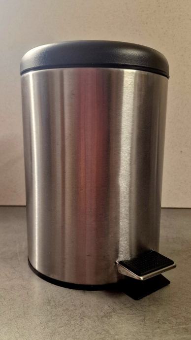Lepo ohranjen koš za smeti iz jekla, s črnim plastičnim pokrovom, snemljivim črnim vedrom s kapaciteto 3 L in pedalom za lažje odpiranje.