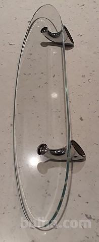 Steklena kopalniška polica s kromiranimi konzolami nemškega proizvajalca kopalniške opreme KEUCO iz serije Cleo, ni bila vgrajena, ker smo kupili drugo ogledalo. Dimenzije dolžina police 65cm, širina 14 cm in debelina 9mm. (Nakupna cena: - nosilci 113,28 EUR, polička 198,66 EUR)