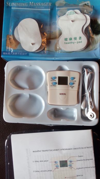Trenutno najmanjši in naj učinkovitejši terapijski stimulator na trgu. Majhna in lahka zasnova. Potrebuje le dve najcenejši 2 x AAA bateriji, ki zdržita skoraj neomejeno terapij in že ga uporabljamo kjerkoli, doma v avtu, službi, sprehodu, vožnji s kolesom, saj se enostavno zatakne za pas. Ima terapevtski učinek ob bolečinah, po pošodbah, neprijetnem počutju, glavobolu, pripomore pa tudi k hujšanju. Aparat je primerljiv z vsemi drugimi aparait ki pa so cenovno veliko dražji a imajo enak učinek kot ta. Ima 8 različnih programov, ki prikazujejo na zaslonu dele telesa za terapijo, sledi 8 jakosti terapije in 8 hitrosti. Priložena so podrobna navodila v Slovenščini. V paketu je aparat, SLO navodila, priključni kabli, dve ovalni blazinici in pa še dve dodatni blazinici ki ju poklonim zraven. Dobite lahko tudi blazinice, par 3.- eur. Kličite le resni. Pošljem po povzetju.