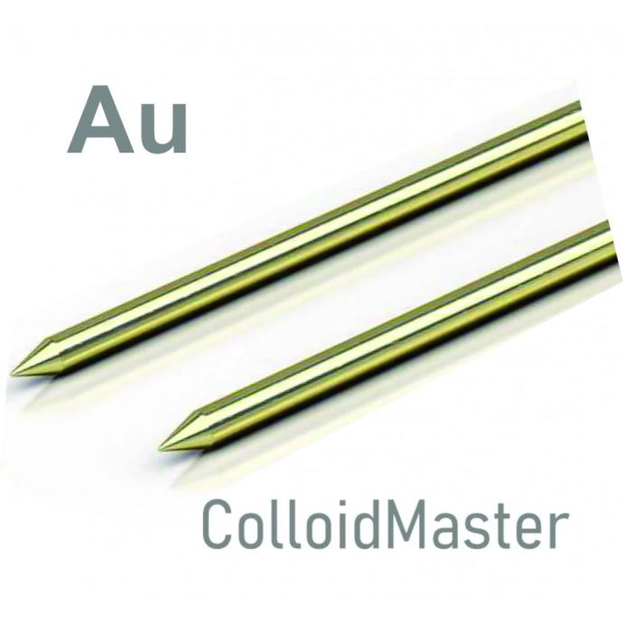 **Par visokočistih elektrod iz zlata (99,99 %)** s posebnim **2 mm priključkom**, ročno spajkano za optimalno povezljivost. Namenjene za uporabo z generatorji, kot je **CM2000**, za **koloidno zlato**.