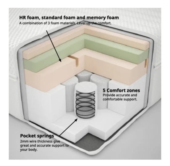 Ima več plasti pene, vključno z obilno zgornjo plastjo zelo prožne pene, cone udobja in žepkaste vzmeti, ki se premikajo neodvisno in sledijo telesu – najboljši možni pogoji za odličen spanec!
