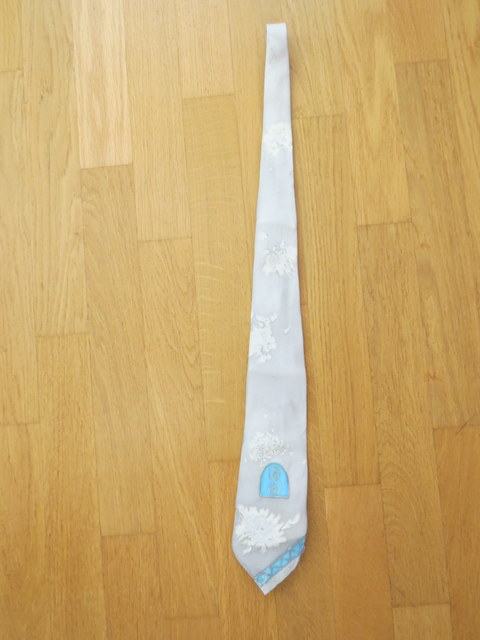 Prodam moško kravato, srebrne barve z ročnim slikanjem v modri barvi, material: 100% svila, zelo malo nošena.