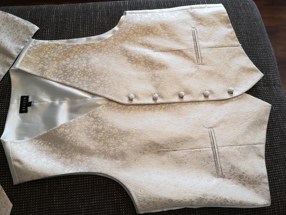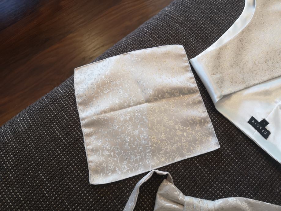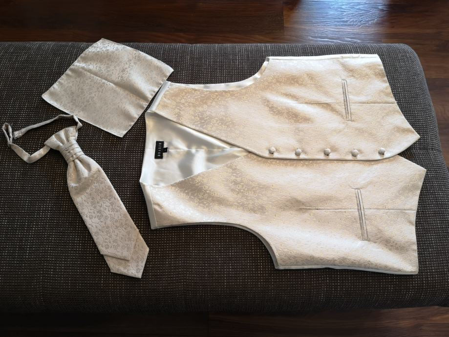 Prodam enkrat nošen moški poročni telovnik s kravato in okrasnim robcem.