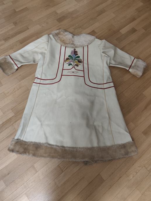 Plašč je unikaten kroj in barva. Debel, svetel material (umetno usnje) z rdečimi okrasnimi vrvicami in krznenimi (umetno krzno) robovi.