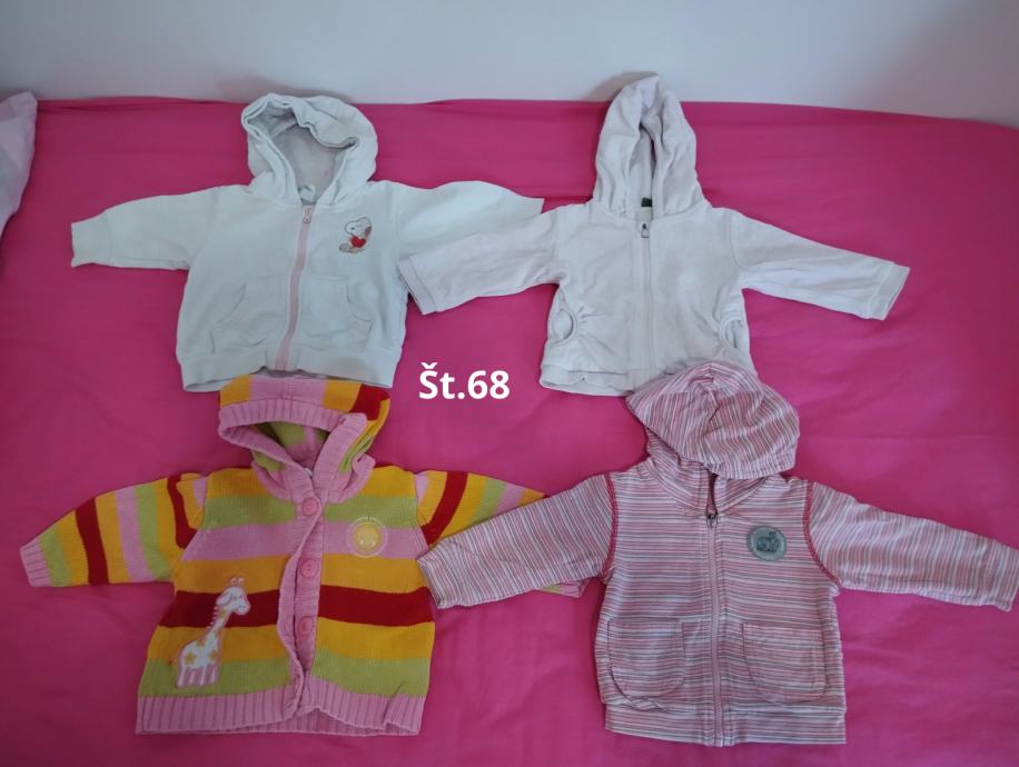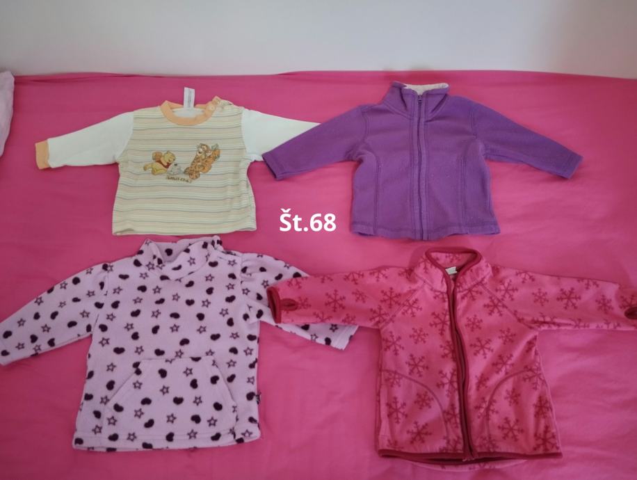 Velikost 68. Lepo ohranjene. Cena je 1eur na kos oziroma še manj - po dogovoru. Imam še več oblačil kot jih je na sliki. Osebni prevzem v Kranju. Lahko pošljem po pošti na vaše stroške. Plačilo preko trr ali flik.