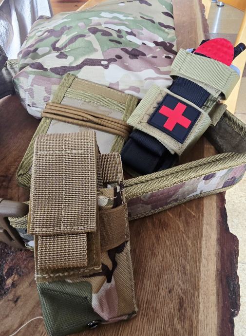 NOVO!!! Taktični pas CAMO dolžine 130cm širine 5cm + tok za pištolo(univerzalni) + torbica za nabojnik oziroma solzilec + komplet turniquet[kompresiska obveza]) + vreča za opremo(nabojnike) + card holder(za 4 kartice in pisalo)