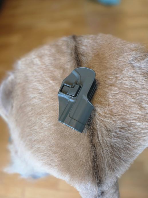 Univerzalni tok za medium size delovne pištole velikosti G19. Tok je nastavljiv. Nastavek za nošnjo na pasu. Primerno za airsoft.