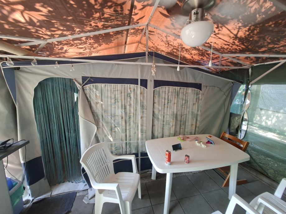 Prodamo več opreme za kampiranje, dodaten box 2,5 m x 2 m , ki je služil kot kuhinja in prostor za shranjevanje opreme preko zime. Aluminjasto konstrukcijo za streho mere cca 8mx5m. Predprostor za adrio 380, rabljen vedno pod streho, lani menjanje zadrge.