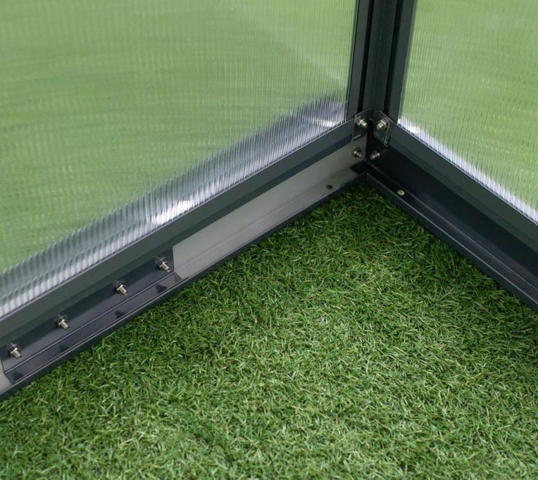 Okvir brezčasnega rastlinjaka je izdelan iz trpežnega aluminija. Za streho in stranske plošče rastlinjaka so uporabljene 4 mm polikarbonatne dvostenske plošče – plošče zagotavljajo optimalno izolacijo in spodbujajo idealne svetlobne pogoje v rastlinjaku. Priloženo strešno okno zagotavlja dodatno prezračevanje in boljšo cirkulacijo zraka v vašem rastlinjaku. Konstrukcija rastlinjaka je izjemno preprosta: profili in povezave se vstavijo drug v drugega in se skupaj privijejo.