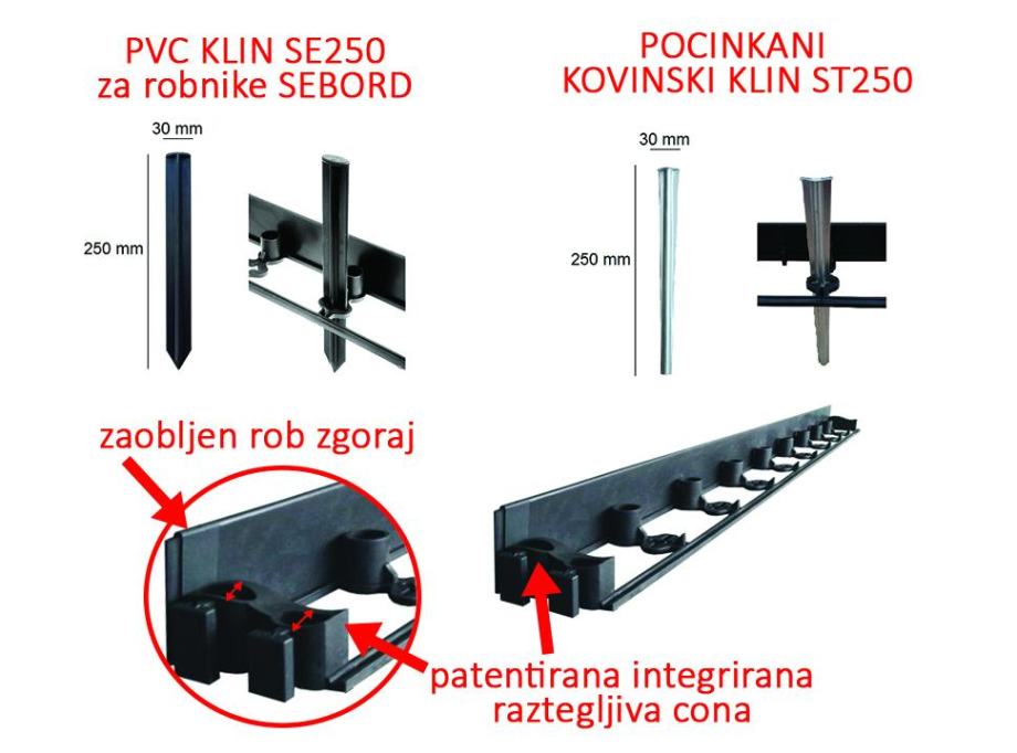 PVC robnik SEBORD z zaobljenim robom zgoraj proti poškodbam in patentirano integrirano raztegljivo cono, katera omogoča širitev in krčenje pri različnih letnih temperaturah. V poletnih mesecih trava ostane zelena do roba. Sestavljanje je enostavno na klik sistem.