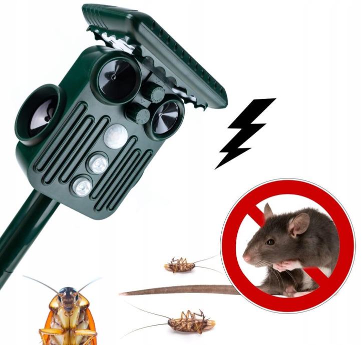 Učinkovit odganjalec živali, ki deluje na principu oddajanja različnih ultrazvočnih frekvenc in močne LED svetlobe.