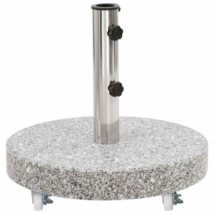 Naš podstavek za senčnik iz trdnega granita zagotavlja močno in stabilno osnovo za vaš senčnik. Preprečil bo, da bi se vaš senčnik podrl zaradi vetra. Ta 30 kg podstavek za senčnik je izdelan iz močnega granita, zato je izjemno stabilen in zagotavlja, da bo vaš senčnik lepo stal tudi v vetru. Podstavek za senčnik ima 2 sornika za namestitev droga na mesto. Priložen je en adapter, zato je podstavek za senčnik primeren za senčnike z drogom premera 38 mm. Podstavek za senčnik s 4 kolesci boste zlahka premikali.