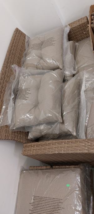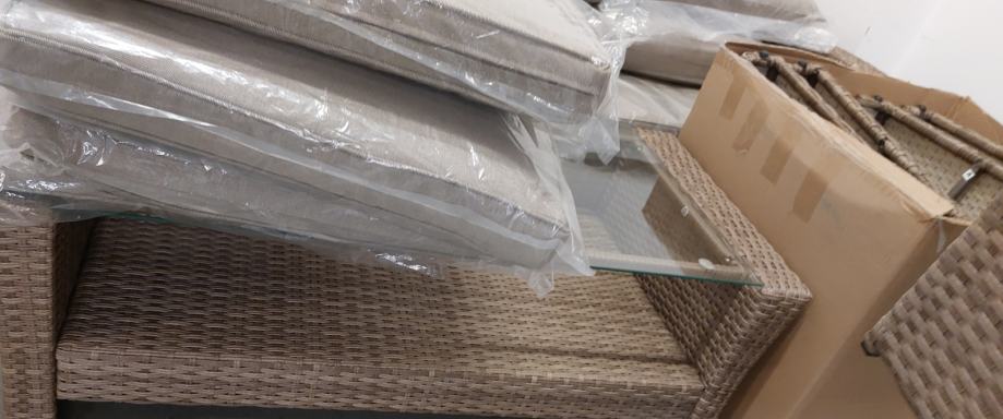 Klop/sedežna, 2x stol z naslonjalom (manjkata konstrukcijska naslonjala), 2x tabure, miza s steklom, blazine za sedišče in naslon, material ratan, varjeno kovinsko zaščiteno ogrodje. Glavna klop z dvižnim sediščem, pod sediščem prostor, kamor se spravi blazine.