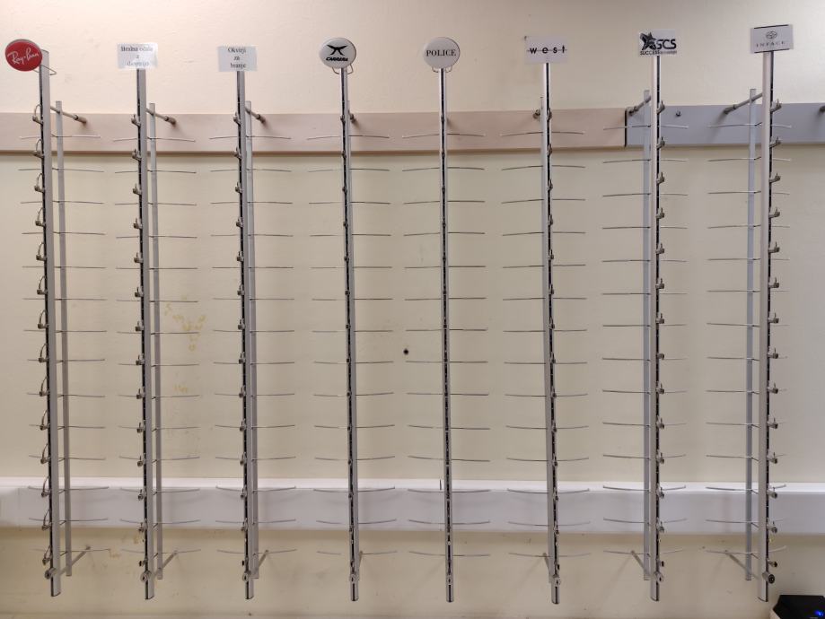 Prodam 8 stojal za očala PresentaNova z LED osvetlitvijo (14 mest) in 3 stojala Tehnicom na el. daljinski zaklep (15 mest) (brezplačno dodam še 2 manjši stojali na zaklep po 6 mest in RayBan stojalo za 24 sončnih očal.) Stroj za brušenje stekel BRIOT Silver, Dioptrimeter digitalni TopCon LM-P6, Stroj BS za rezanje utorov – laks, Ventileta za očala BS, stroj za testiranje foto stekel in napetost stekel GFC, stroj za elektro varjenje očal, očala za dioptrijo, sončna očala, stekla CR-39 in mineralna, 21 kom kontaktnih leč AirOptics, vse vrste klešč ter ostali drobni material, razno orodje in vijaki za montažo optika.
