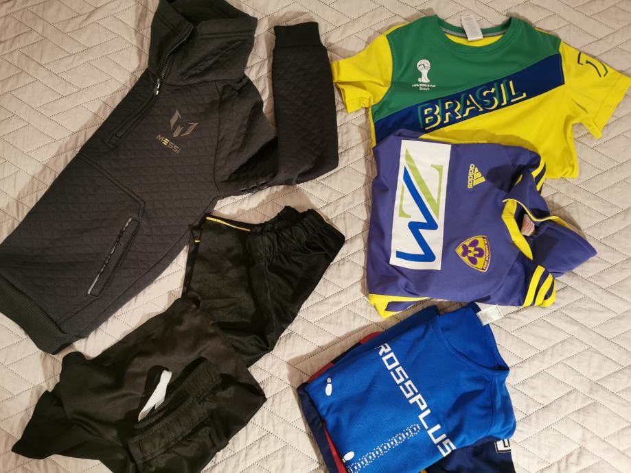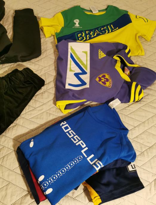 Komplet za nogometaša 128-140. Vsebuje pulover za čez glavo, 2x kratke hlae, 2x majica in zložene 2 (podarim, le za doma, imata pomanjkljivosti). Primerno za fanta, ki je bolj suhcene postave.