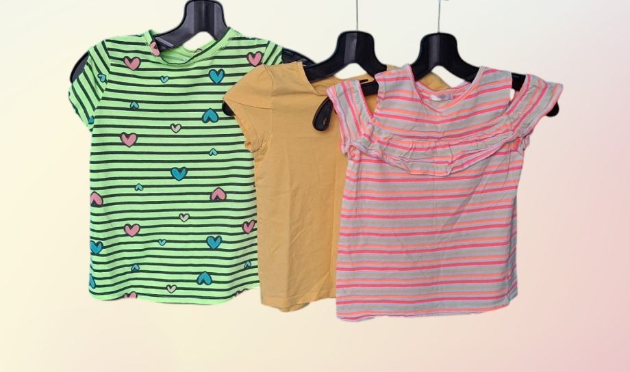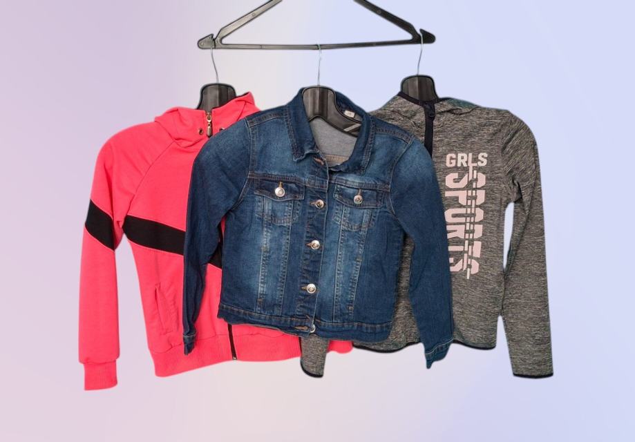 3x jakna in športni jopici, 4x dolge hlače, trenerka, legice, 2x baggy hlače, 4x kratke majice, obleka, pijama, flis mikica,... + podarim po želji oblačila z napako (za doma).