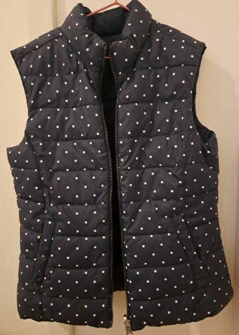 1x nošen in brezhiben brezrokavnik za punce. Srednje debel, material kot bunda, znotraj ima polnilo. Nosljiv na obeh straneh. Barva: temno modra, pikice bele. Na obeh straneh ima spredaj dva žepa.