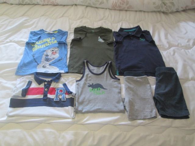Polo majica spodaj je več nošena, ampak še vedno dobro ohranjena, majica brez rokavov je odlično ohranjena, mehka, sive kratke hlače so kot nove (enkrat oblečene), modre kratke hlače pa so več nošene, malo zmuckane in za doma.