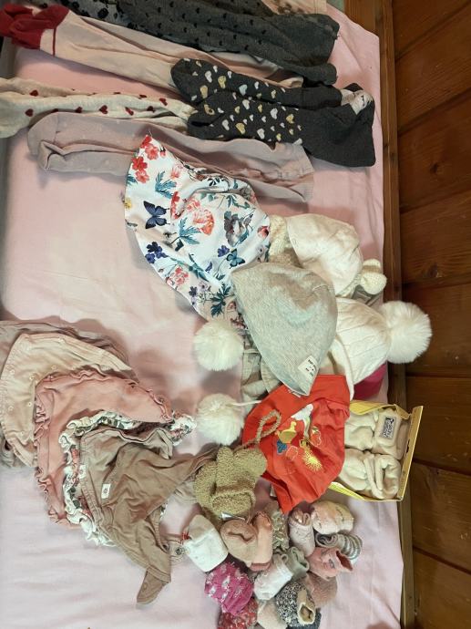 Hlace, pajkice, bodiji, jakne, zimski pajac, jopice, zabe.. dodatno se previjalna podloga, ogledalo za v avto, majhen kovter in oblacilo.