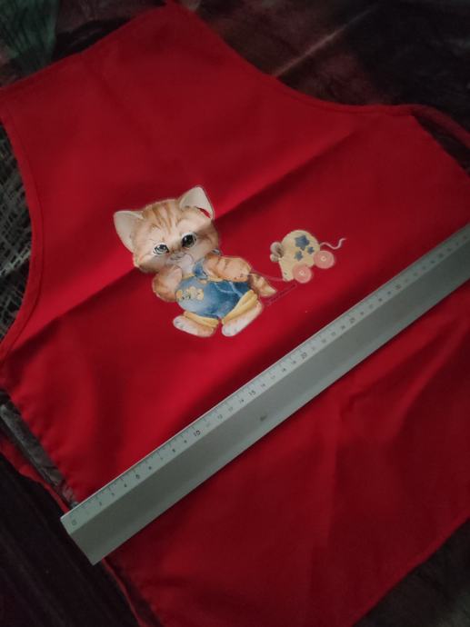 Predpasnik je bombažen, nov, z lepo našito mucko, primeren za otroke. Velikost je razvidna iz priloženih fotografij, merilo je v velikosti 50 cm!