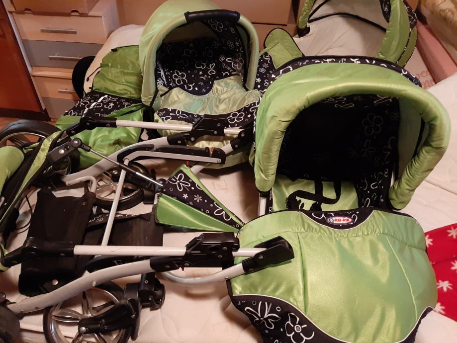 Prodam otroški voziček 3v1 v zeleno-črni kombinaciji. Komplet vsebuje podvozje, košaro, športni del, jajčka 2x, marela, zimska vreča, torba, ima napihljiva kolesa.