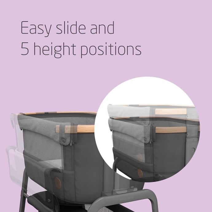 Mrežasto okno na strani zagotavlja optimalno prezračevanje in vam kot staršu omogoča, da pazite na svojega malčka. Na ta način bo vaš otrok lepo spal blizu vas in občutil bo varnost in prisotnost mamice. Lahko se prilagodi v 5 različnih višinah, zaradi česar je primeren tudi za uporabo poleg ležiš.