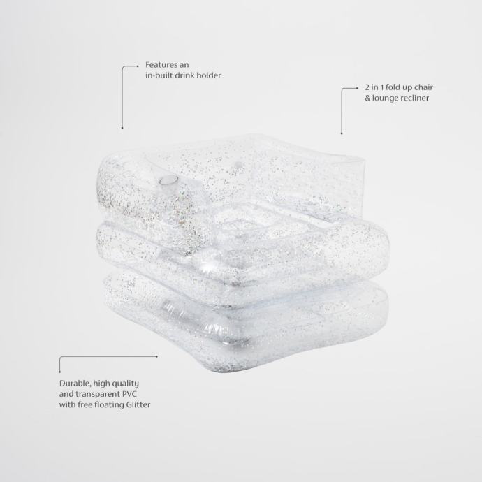 Iz klasične blazine za ležanje se napihljiva blazina z enim samim gibom zloži v udoben fotelj, tako si lahko privočite počitek ali posedanje na gladini morja ali bazena.