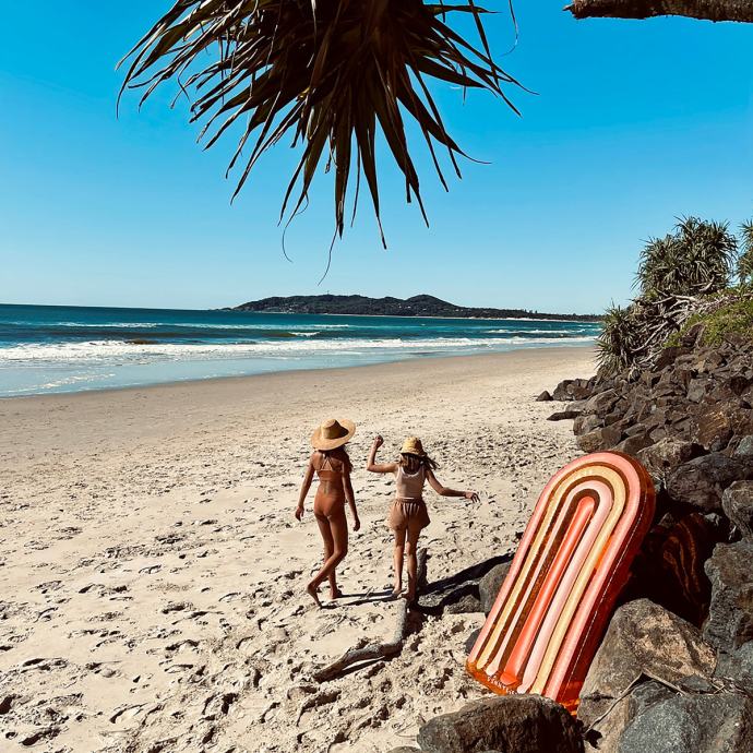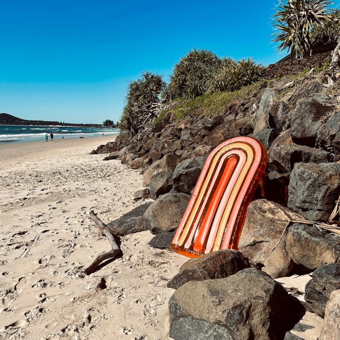 Napihljiva blazina za zabavno ali počitek v vodi s privlačno ilustracijo mavrice odeta v prelepih odtenkih sončnega zahoda.