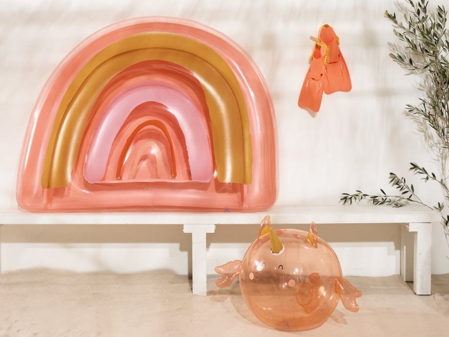 Napihljiva otroška plavalna blazina Sunnylife Rainbow Surf Rider za obilico vodne zabave in nove vodne pustolovščine.