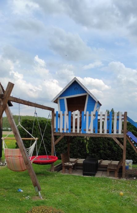 Prodam otroška igrala, ki vsebuje hisko, ki ima okna zaprta s plexi, znotraj so klopi za sedenje, podest 3x3m z ograjo, plezalna stena, stopnice z ograjo, tobogan, peskovnik s prof. peskom, ter ogrodje za 3 gugalnice.