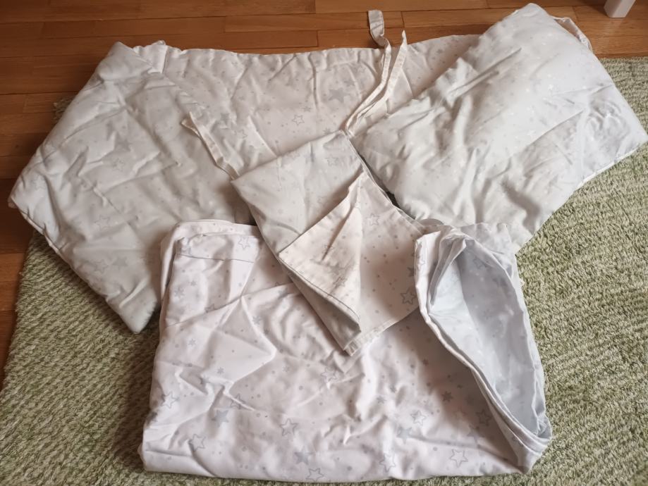 Prodam otroško posteljnino z zvezdami 100*140cm, ena stran bela s sivimi zvezdami, druga stran siva z belimi zvezdami. V kompletu tudi mehka obloga za vzglavje posteljice. Prodam 1 belo rjuho 100*140cm.