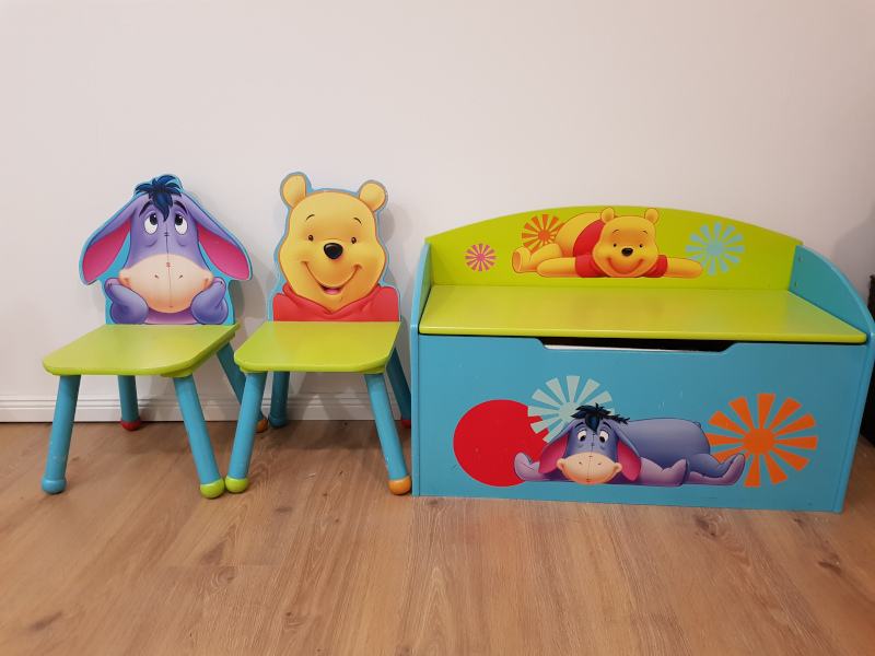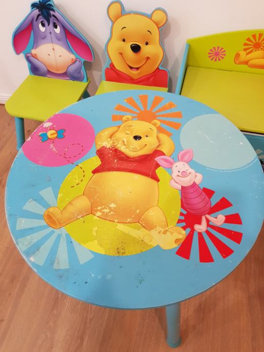 Prodam lesen otroški komplet, ki ga setavljajo2 stola, mizo in skrinjo Winnie Pooh.