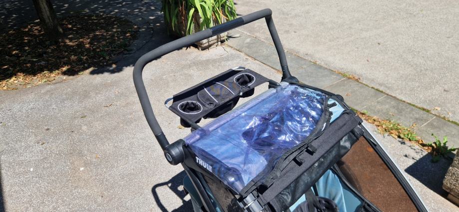 Razen mikro poškodbe sprednje mreže kot nova, z vsemi originalnimi pritiklinami: dežna prevleka, zastavica, QR os in adapter za kolo.