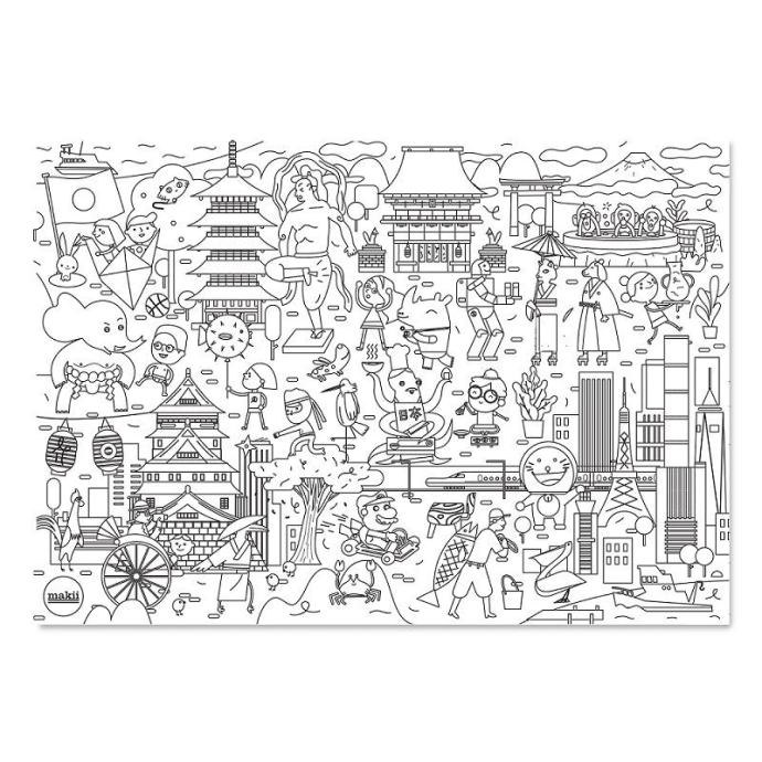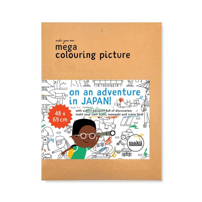 Čudovita otroška pobarvanka Pustolovščina na Japoskem! v velikosti XL z mini potnim listom, polnim odkritij in dogodivščin. Prilepi jo na steno, položi jo na tla ali mizo in pobarvaj veliko Makii pobarvanko. Povabi še prijatelje in priredi nepozabno zabavo.