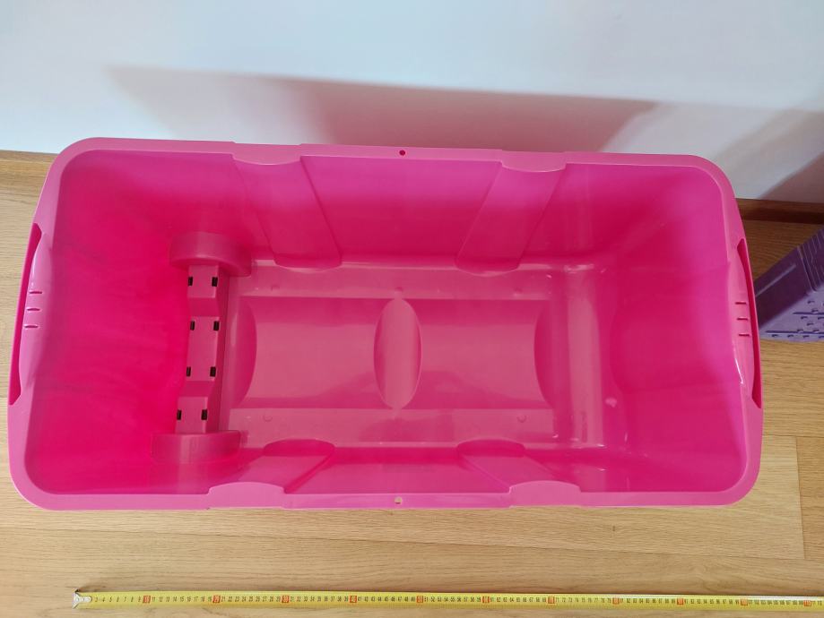 Prodam lepo ohranjeno škatlo za shranjevanje roza barve. Dimenzije cca 40 x 40 x 80cm, prostornina cca 100L. Guma na kolesih je malo obrabljena.