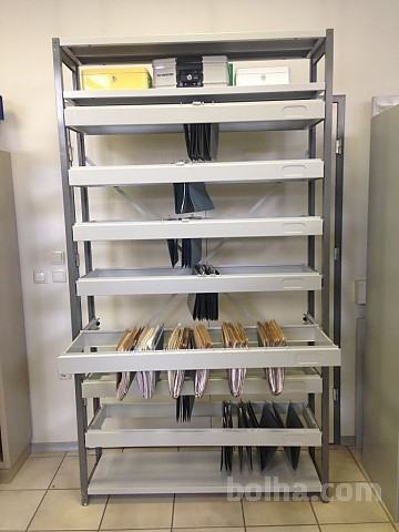 Na zalogi večja količina regalov za arhiviranje dokumentacije v visečih mapah. Montaža okvirjev je možna po izboru kupca. Na zalogi samo širina 120 cm, globina 40 cm. Okvirji za viseče mape se lahko montiranjo po celotni višini regala, ki znaša največ 7 izvlečnih okvirjev po višini. Skupna višina regala je 225 cm . Na vrhu je prostor še za dodatno odlagalno polico. Idealno za pisarne kjer je potrebno arhivirati veliko dokumentacije na majhnem prostoru. Regali se lahko opremijo z lesenimi zaključki. Potrebna je dodatna pritrditev v steno.