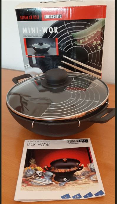WOK - litoželezni, 24cm, s pokrovko in mrežico za odlaganje. NOV. Navodila za uporabo z recepti v 4. tujih jezikih (D, GB, F, I) in kratka navodila v SI.