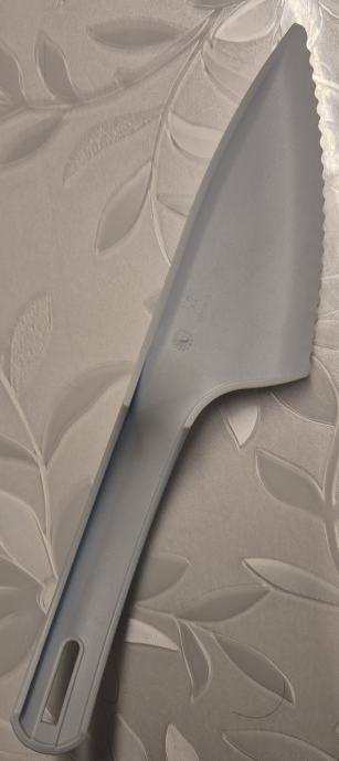 Prodajam rabljeno lopatko za torto v sivem odtenku, ki je idealna za serviranje sladkih dobrot. Elegantna oblika z nazobčanim robom omogoča enostavno rezanje in serviranje tort. Lopatka je v dobrem stanju in primerna za vsakodnevno uporabo.